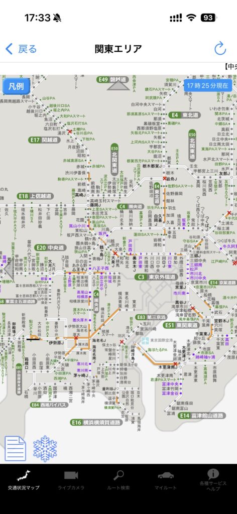 事故や工事による通行止め情報もリアルタイムで反映されます。知らずに走って迂回を余儀なくされる事態を防げます。