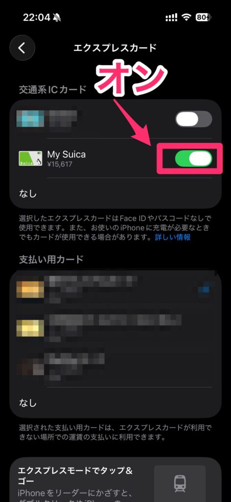 私の場合、原因はiPhoneウォレットのエクスプレス設定が解除されていたことでした。