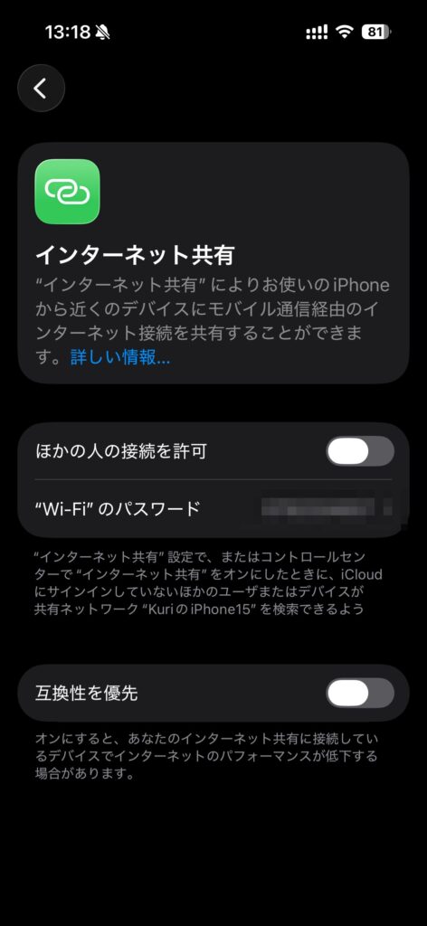 ※iPhone側は「設定」→「インターネット共有」は以下の設定で大丈夫です。